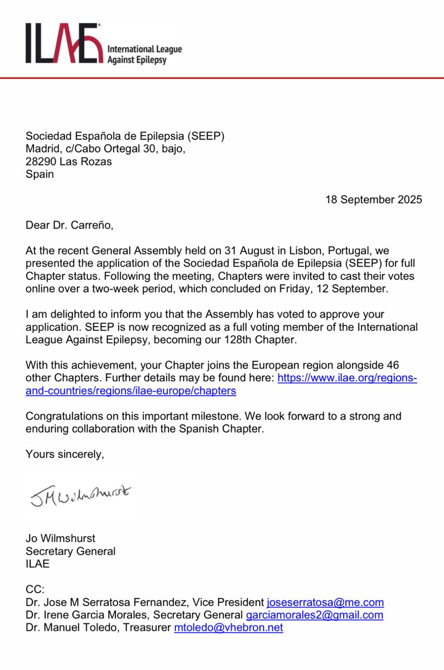 La Asamblea General de la International League Against Epilepsy (ILAE) celebrada en Lisboa el 31 de agosto de 2025 ha aprobado, tras votación de sus miembros, la incorporación de la Sociedad Española de Epilepsia (SEEP) como Capítulo Oficial Español de la ILAE con plenos derechos.