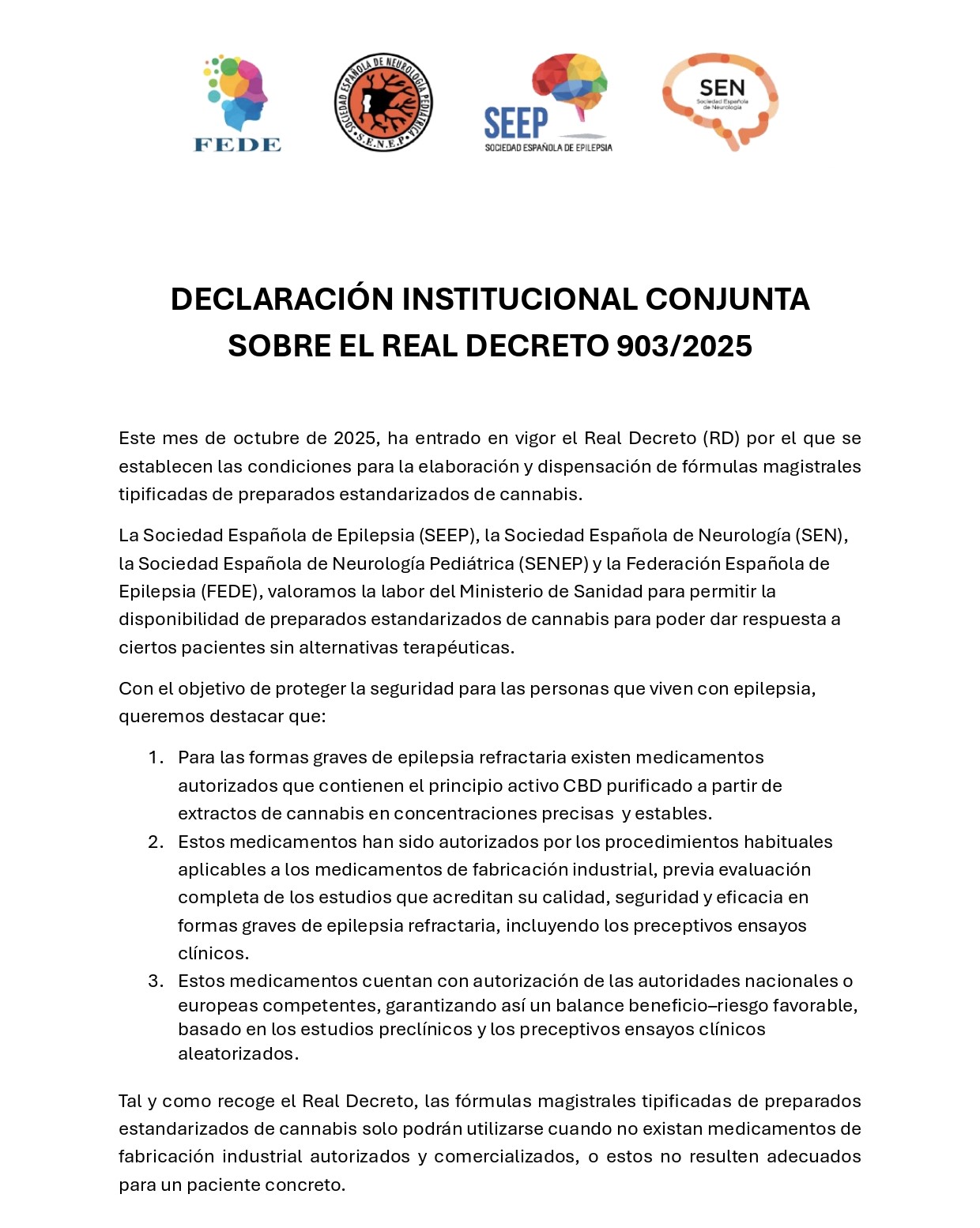 Con la entrada en vigor del Real Decreto que regula las fórmulas magistrales de preparados estandarizados de cannabis, la Sociedad Española de Epilepsia (SEEP), la Sociedad Española de Neurología (SEN), la Sociedad Española de Neurología Pediátrica (SENEP) y la Federación Española de Epilepsia (FEDE) valoran esta medida a través de la siguiente Declaración Institucional Conjunta.
